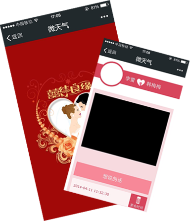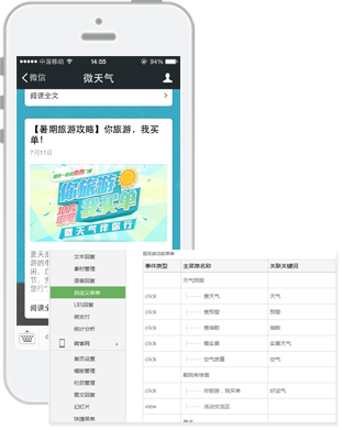 微生活提供微信公眾號自定義菜單管理功能,用戶無需再通過輸入關(guān)鍵詞觸發(fā)回復(fù),直接點擊菜單就可以看相關(guān)的內(nèi)容,微生活可與Wap進(jìn)行打通,復(fù)用APP原有功能,同時可定制個性化功能、使用HTML5新技術(shù)進(jìn)行無限拓展,幫助地方氣象部門打造最便捷、易推廣的微信內(nèi)置APP,此功能如果結(jié)合微信3G網(wǎng)站可以使您的公眾號用戶體驗更好,帶給粉絲不一樣的感受。