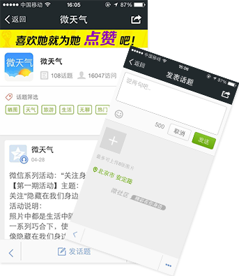 人人都是微話題制造者。近期熱門話題、個人興趣、網(wǎng)友討論多種渠道內(nèi)容,經(jīng)過編輯發(fā)布,就可進(jìn)入該頁面發(fā)布信息進(jìn)行討論交流。增強用戶活躍度,吸引用戶。