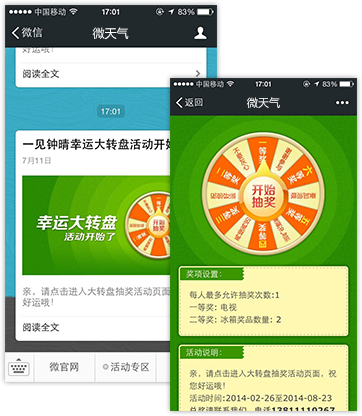 我們將利用微信的強交互性,讓您通過對互動流程、環(huán)節(jié)和方式的設(shè)計,運用各種設(shè)計活動從而實現(xiàn)與用戶的互動交流,整合系統(tǒng)互動符合微信娛樂性強的產(chǎn)品本質(zhì),用戶可結(jié)合自己的有效資源發(fā)起抽獎活動,以增加用戶黏性。