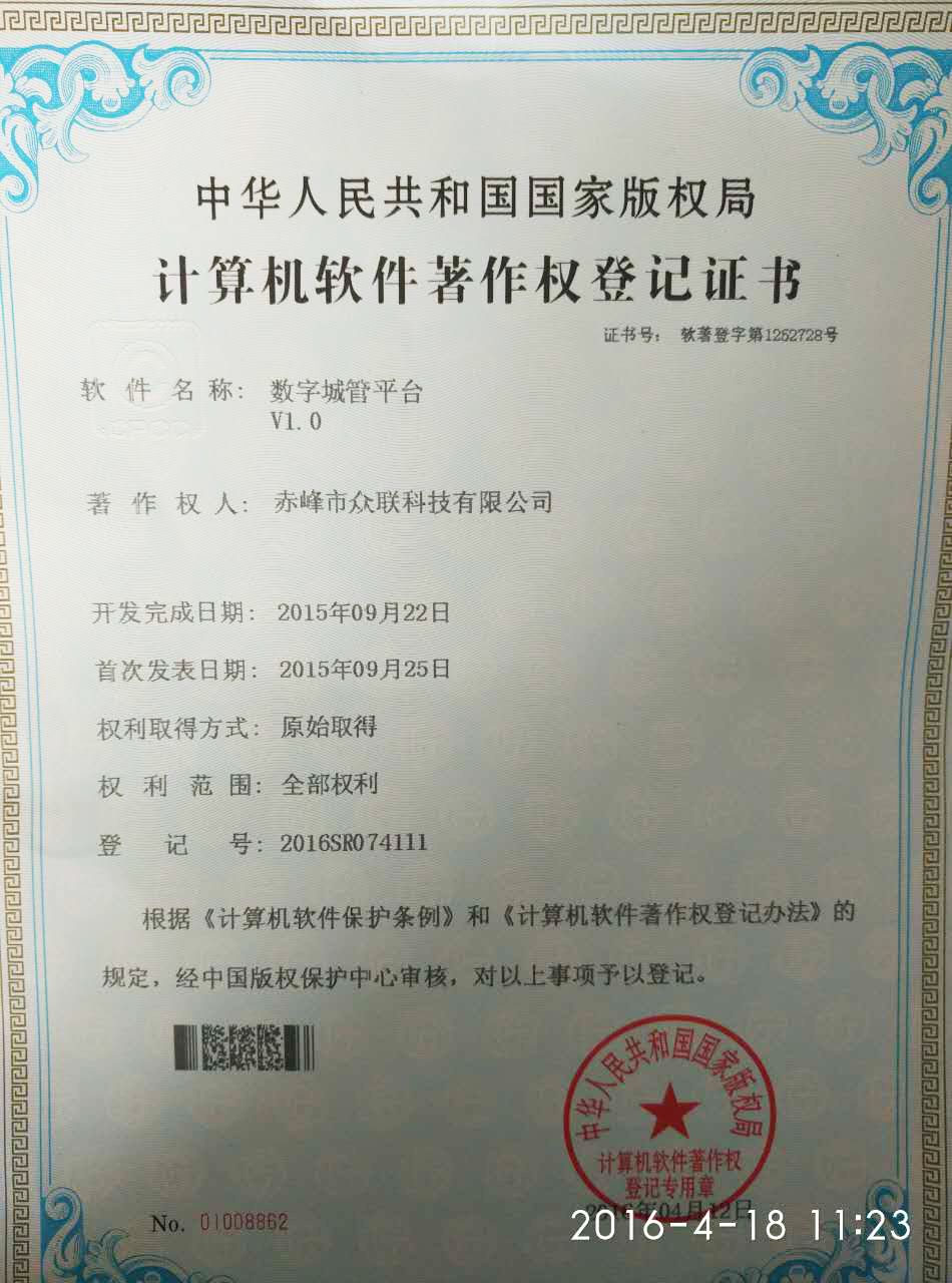 恭賀赤峰市眾聯(lián)科技有限公司通過大家的齊心協(xié)作,取得了“數(shù)字城管平臺”的軟件著作權(quán)!